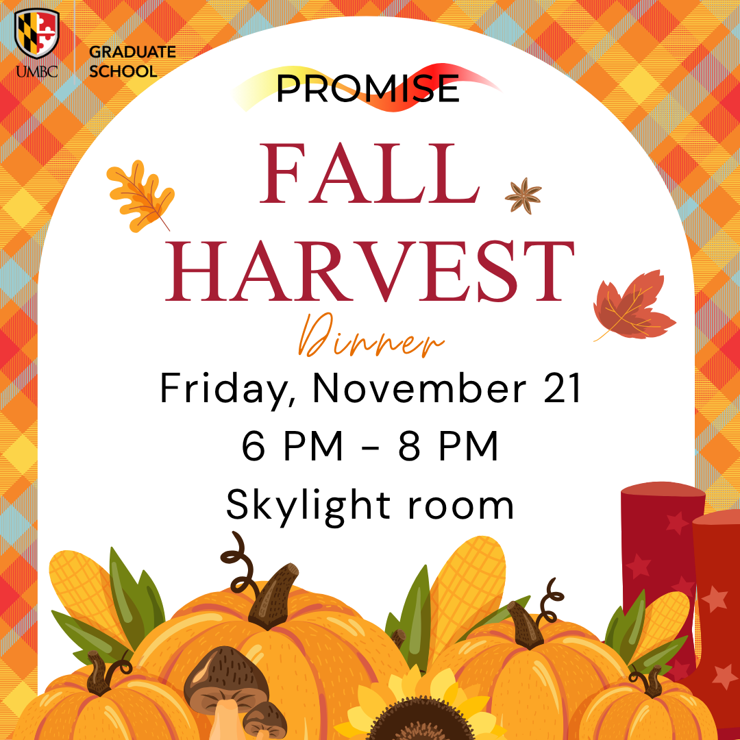 The Graduate School at UMBC and the PROMISE program are partnering this year to host our Annual Fall Harvest Dinner and Networking event on Friday, November 21, 2025 from 6PM to 8PM in person on the UMBC campus in the Commons Building, 3rd floor, Skylight Room.