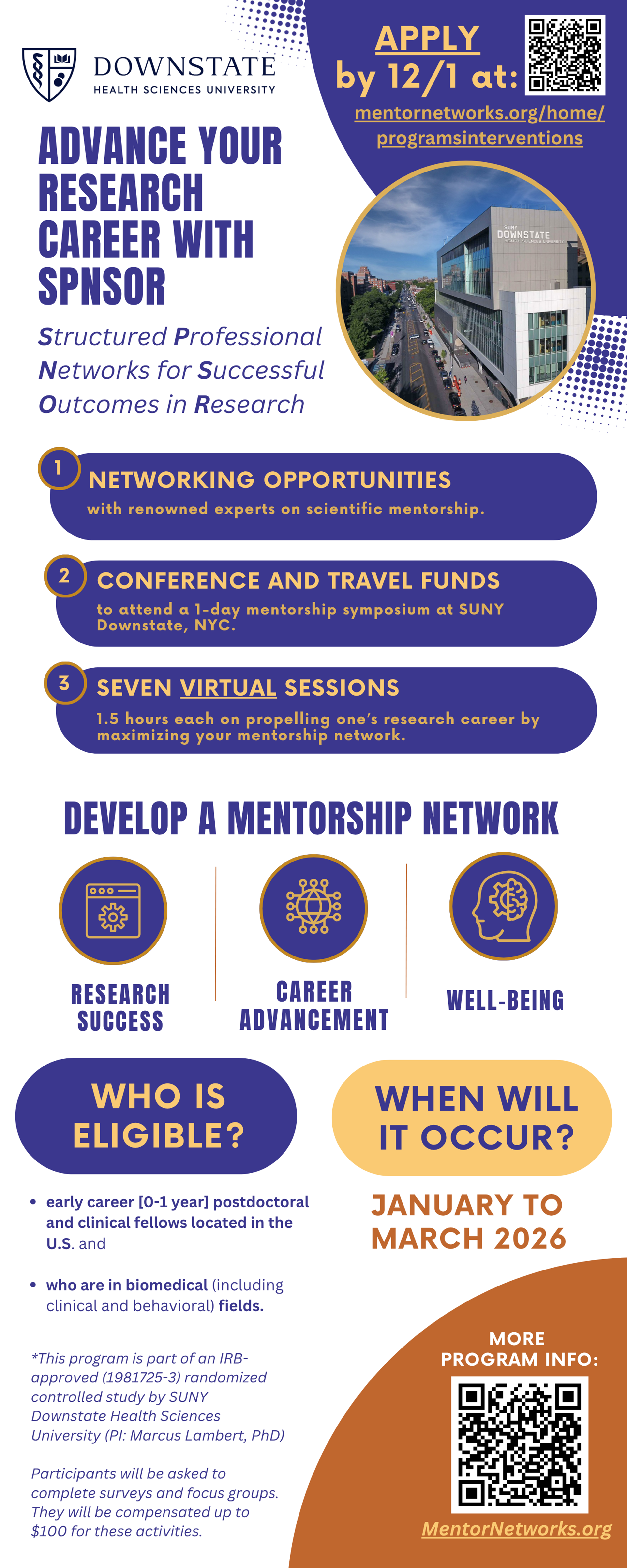 This is a training opportunity for postdocs and clinical fellows to learn and practice building their mentorship network to advance their professional and research goals. This program is part of an NIH-funded research study (IRB Study #1981725, PI: Dr. Marcus Lambert, SUNY Downstate Health Sciences University).